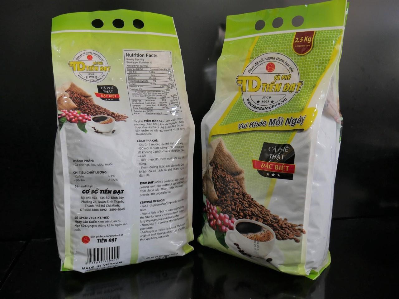 Cà phê Tiến Đạt được sản xuất theo phương pháp khép kín và nguyên liệu được chọn lọc từ cà phê Buôn Mê Thuột. Sản phẩm là 100% cà phê hạt nguyên chất, thích hợp pha phin.